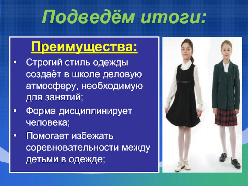 Строгий стиль одежды создаёт в школе деловую атмосферу, необходимую для