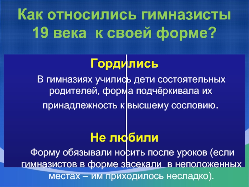 Форму обязывали носить после уроков (если гимназистов в форме засекали в неположенных местах – им приходилось несладко).