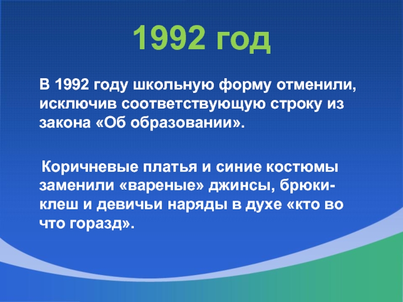 Коричневые платья и синие костюмы заменили «вареные» джинсы, брюки-клеш и девичьи наряды в духе «кто во что горазд».
