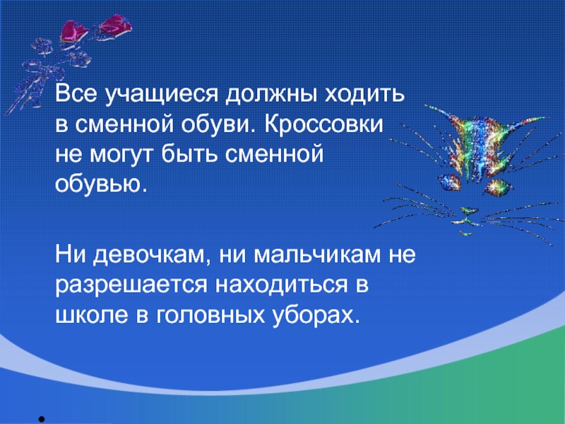 Слайд 31 Все учащиеся должны ходить в сменной обуви. Кроссовки не