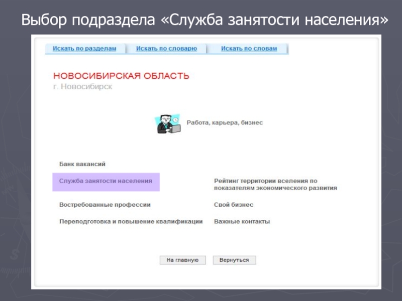 Выбор подраздела «Служба занятости населения»