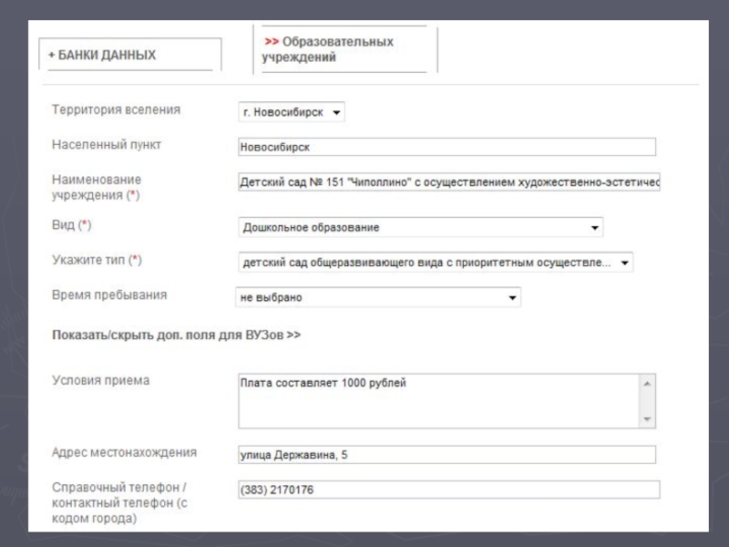 Слайд 38Банк «Образовательных учреждений». Раздел «Дошкольное образование»