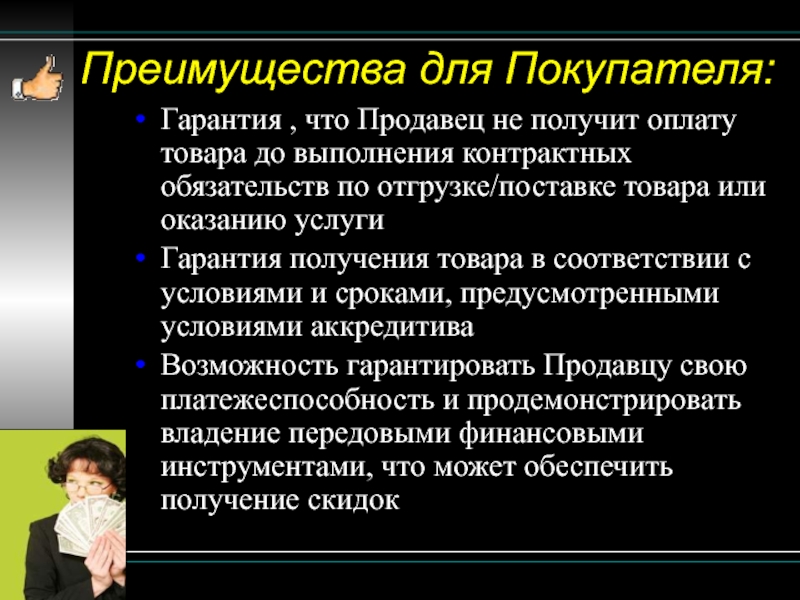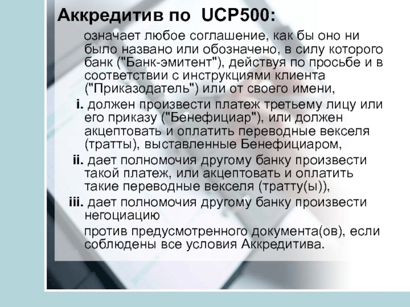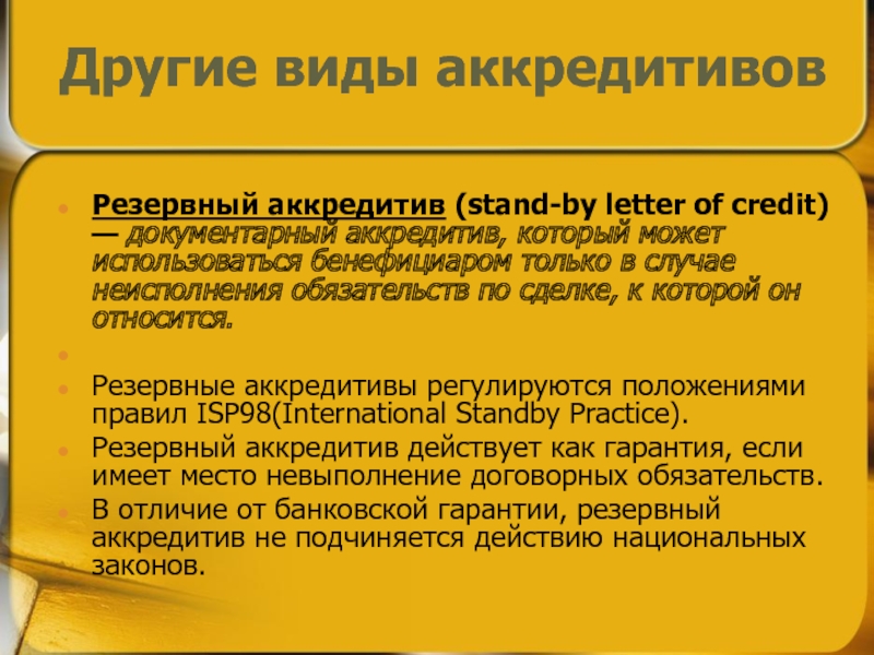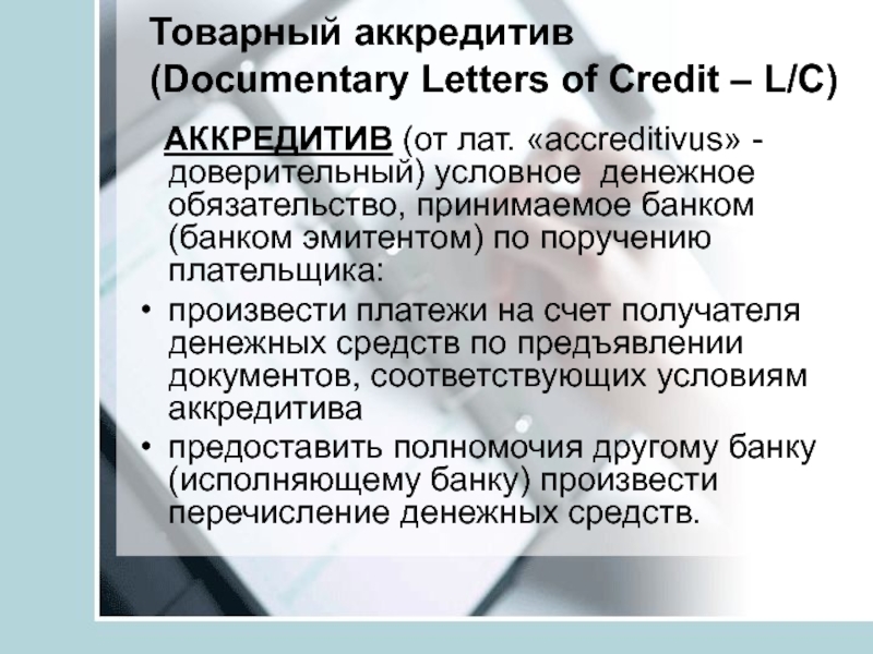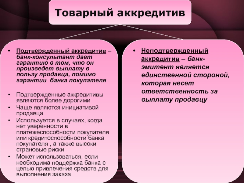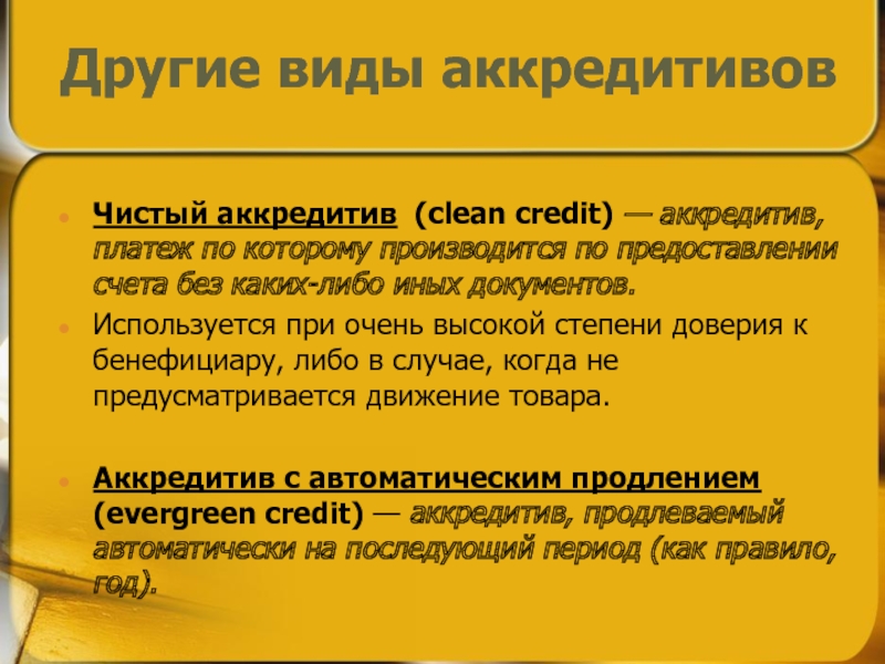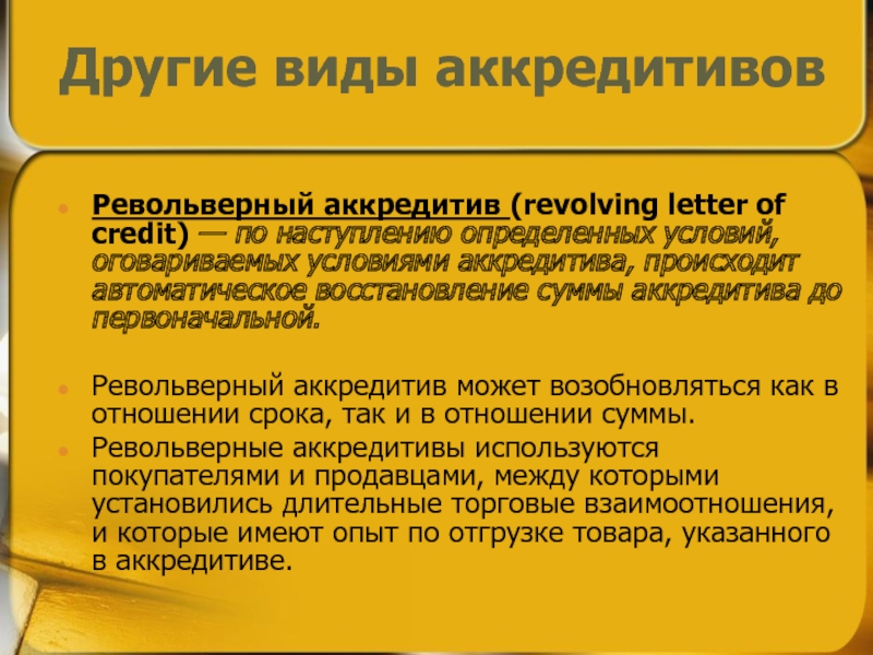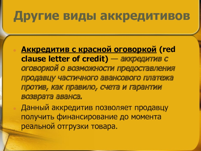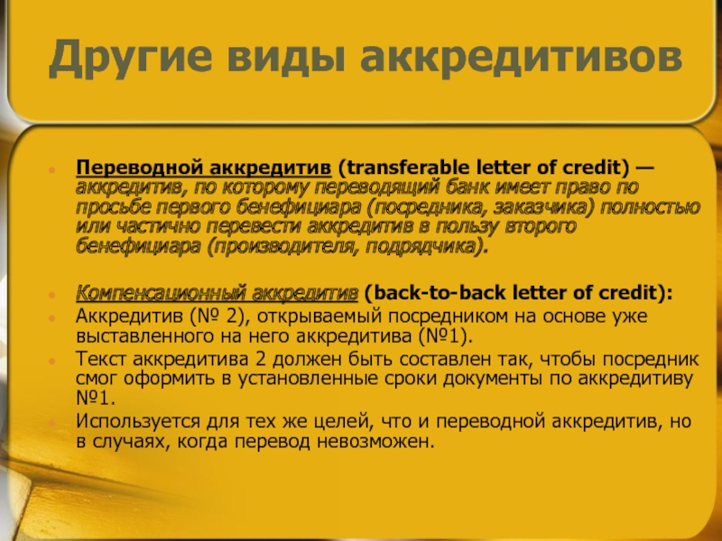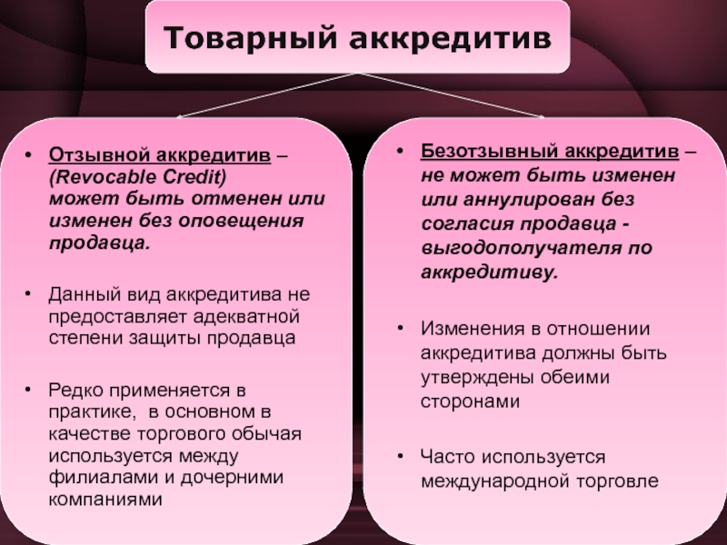 Безотзывный аккредитив –не может быть изменен или аннулирован без согласия продавца -выгодополучателя по аккредитиву.