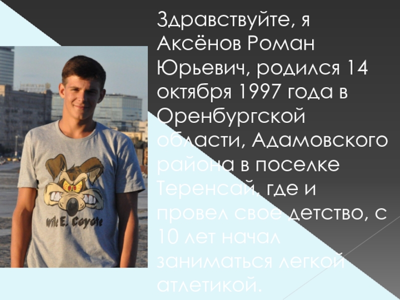 Слайд 3Здравствуйте, я Аксёнов Роман Юрьевич, родился 14 октября 1997 года в
