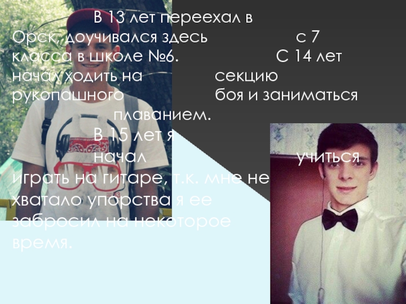 Слайд 4 В 13 лет переехал в Орск, доучивался здесь с 7 класса