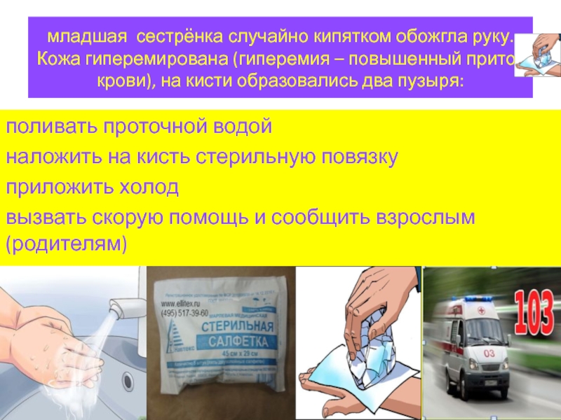 Слайд 28младшая сестрёнка случайно кипятком обожгла руку. Кожа гиперемирована (гиперемия – повышенный