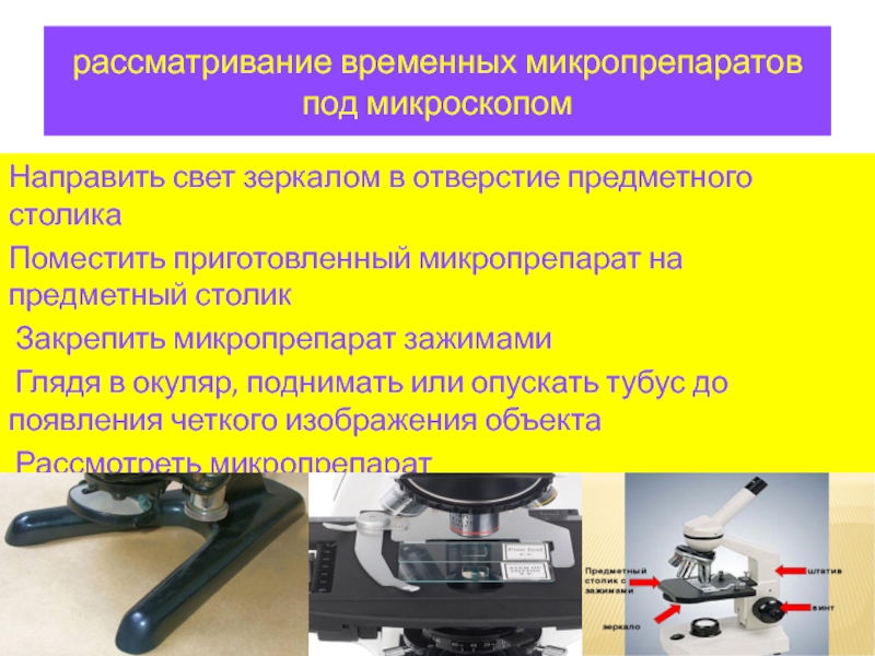 Слайд 18рассматривание временных микропрепаратов под микроскопом
