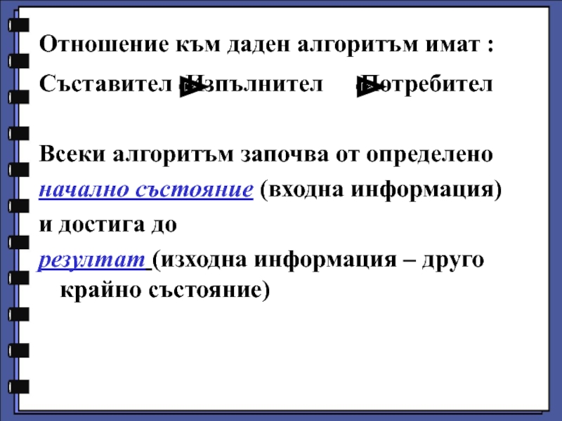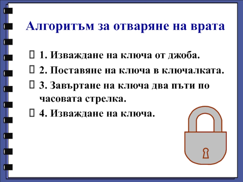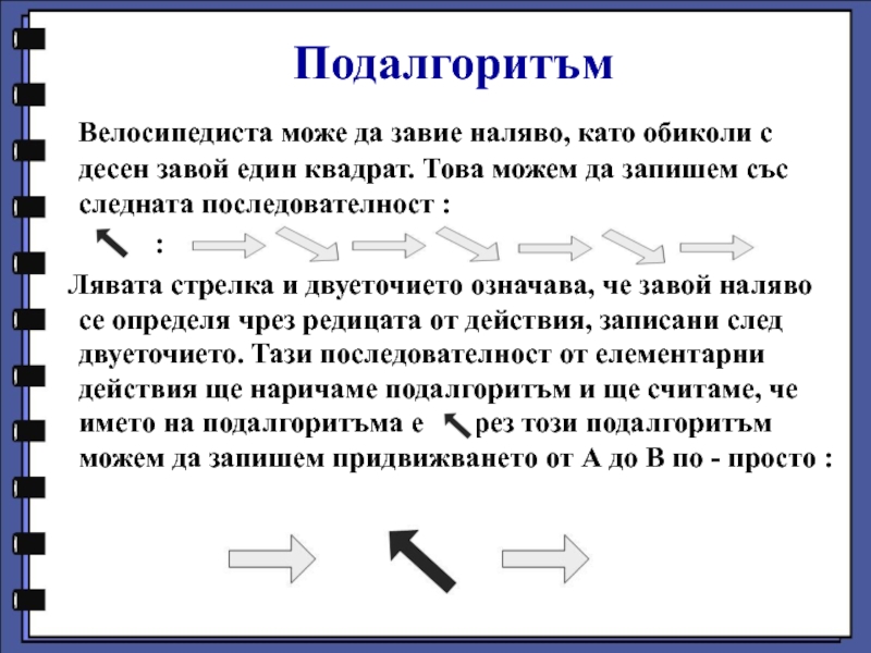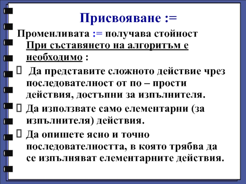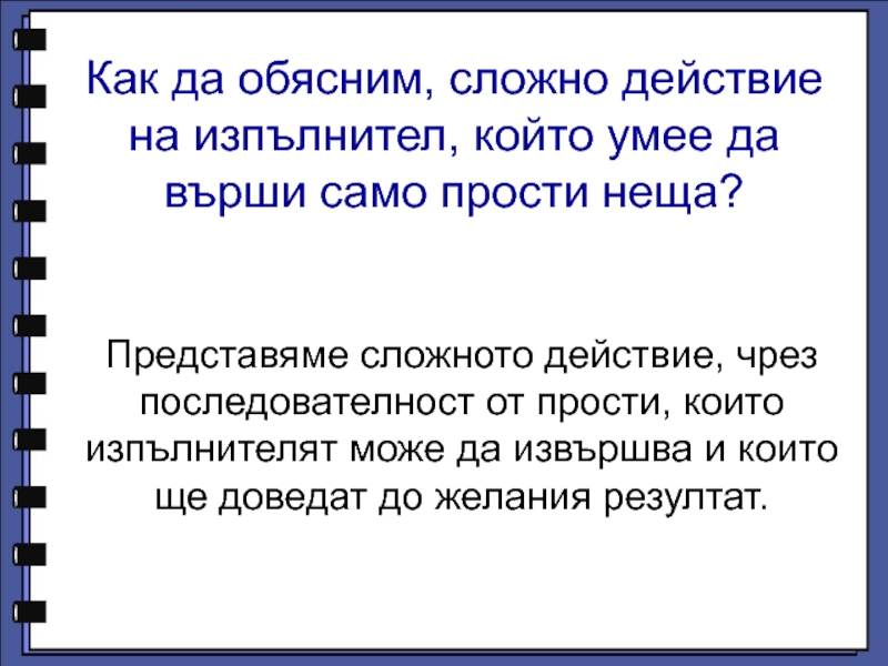 Представяме сложното действие, чрез последователност от прости, които изпълнителят може да извършва и които ще доведат до желания резултат.