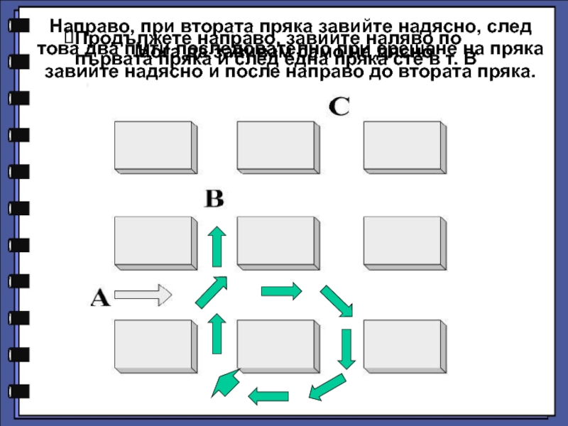Направо, при втората пряка завийте надясно, след това два пъти последователно при срещане на пряка завийте надясно и после направо до втората пряка.