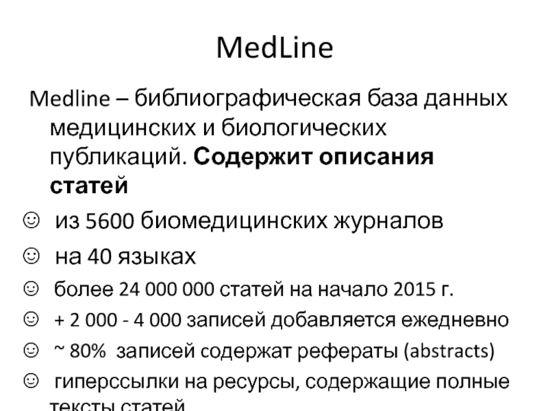 Medline – библиографическая база данных медицинских и биологических публикаций. Содержит описания