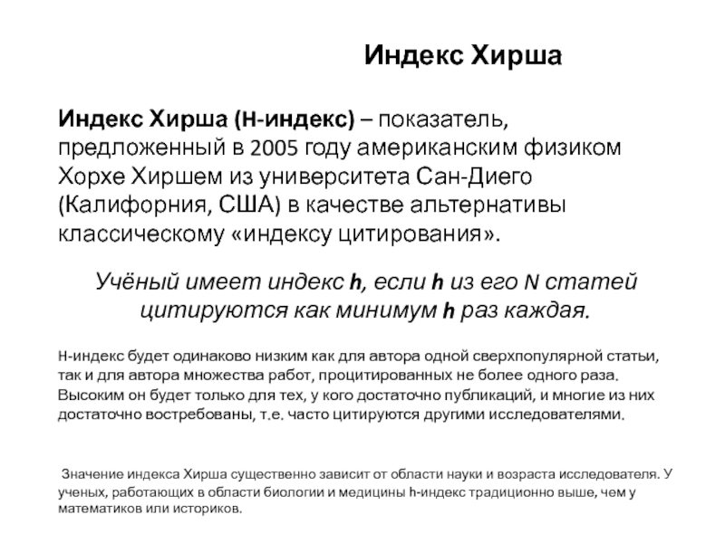 Индекс Хирша (H-индекс) – показатель, предложенный в 2005 году американским