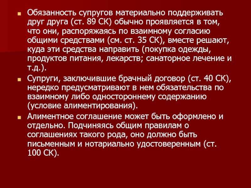 Слайд 2Обязанность супругов материально поддерживать друг друга (ст. 89 СК) обычно проявляется