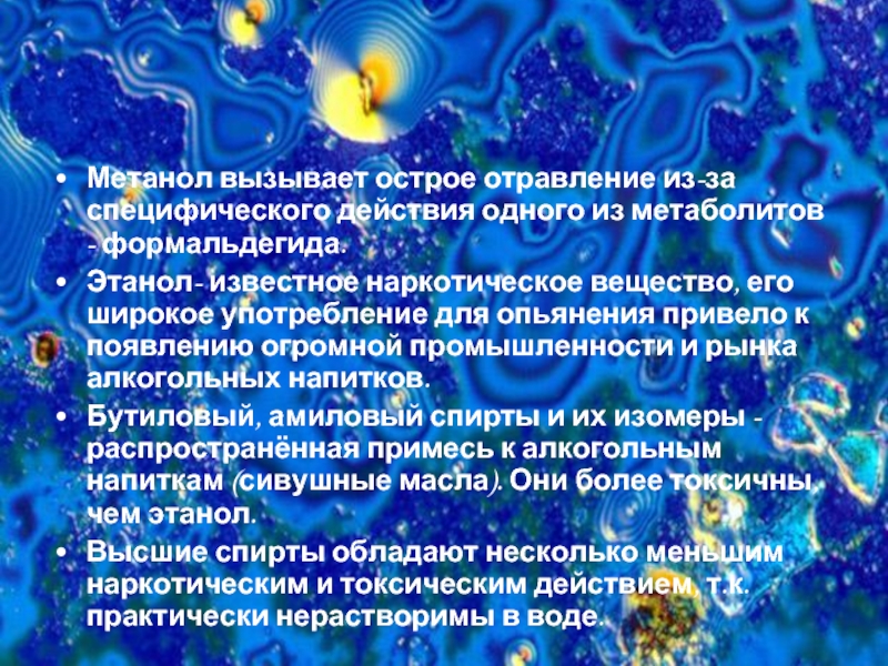 Высшие спирты обладают несколько меньшим наркотическим и токсическим действием, т.к. практически нерастворимы в воде.