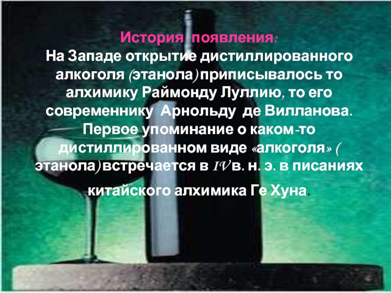 Первое упоминание о каком-то дистиллированном виде «алкоголя» ( этанола) встречается в IV в. н. э. в писаниях китайского алхимика Ге Хуна.