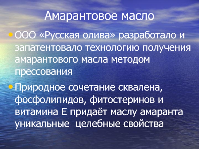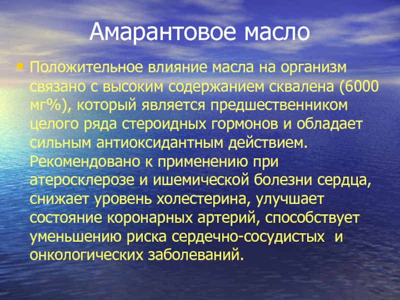 Сквален относится к важнейшим биологически активным соединениям и выполняет в организме роль регулятора липидного и стероидного обмена, является предшественником целого ряда стероидных гормонов, холестерина и витамина Д