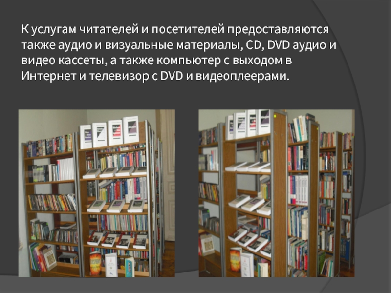 Слайд 4К услугам читателей и посетителей предоставляются также аудио и визуальные материалы,
