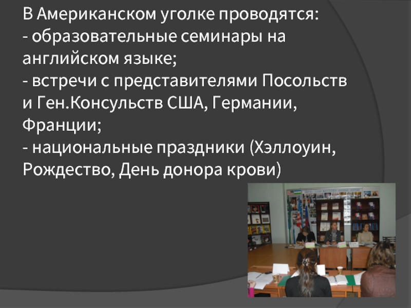 Слайд 5 В Американском уголке проводятся: - образовательные семинары на английском языке; - встречи с