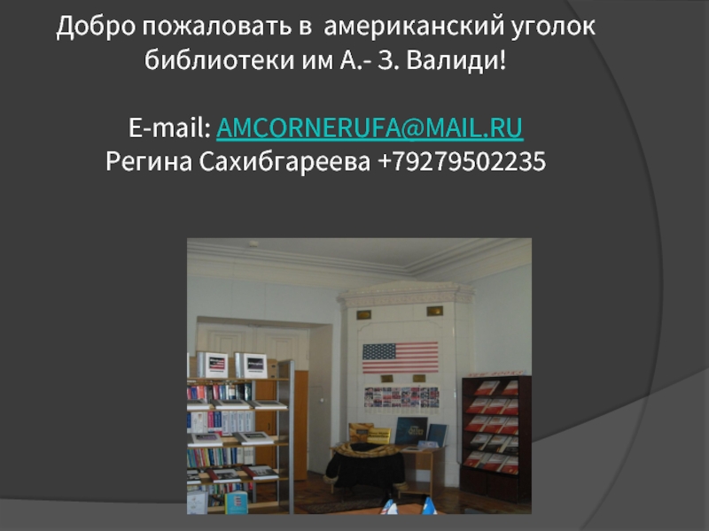Слайд 8Добро пожаловать в американский уголок библиотеки им А.- З. Валиди! E-mail: AMCORNERUFA@MAIL.RU Регина