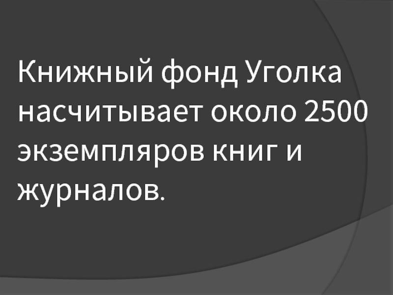 Слайд 3Книжный фонд Уголка насчитывает около 2500 экземпляров книг и журналов.