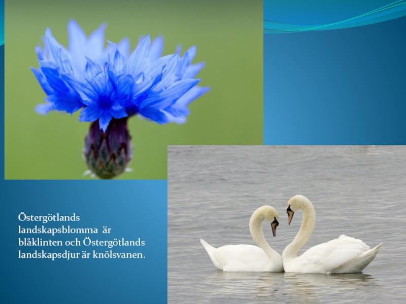 Östergötlands landskapsblomma är blåklinten och Östergötlands landskapsdjur är knölsvanen.