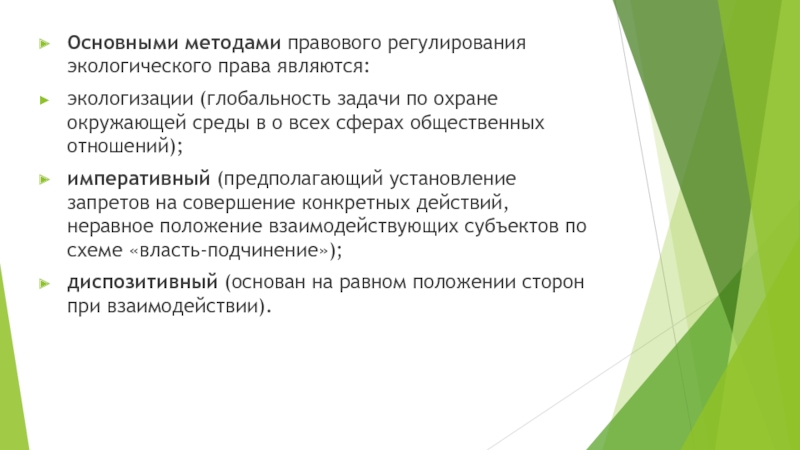 Слайд 9Основными методами правового регулирования экологического права являются: