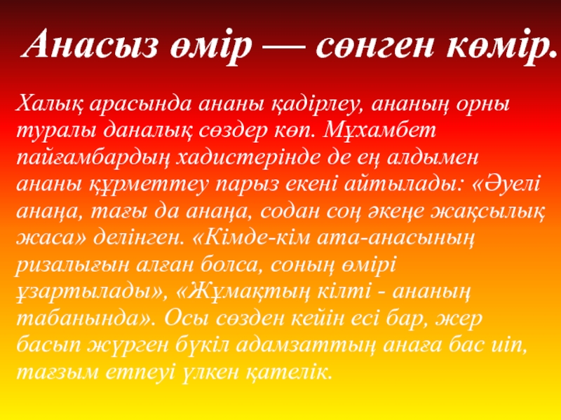 даналық сөздер көп. Мұхамбет пайғамбардың хадистерінде де ең алдымен ананы құрметтеу парыз екені айтылады: «Әуелі анаңа, тағы да анаңа, содан соң әкеңе жақсылық жаса» делінген. «Кімде-кім ата-анасының ризалығын алған болса, соның өмірі ұзартылады», «Жұмақтың кілті - ананың табанында». Осы сөзден кейін есі бар, жер басып жүрген бүкіл адамзаттың анаға бас иіп, тағзым етпеуі үлкен қателік.