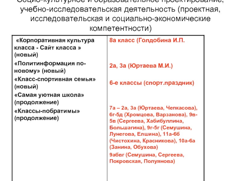 Слайд 9Социо-культурное и образовательное проектирование, учебно-исследовательская деятельность (проектная, исследовательская и социально-экономические компетентности)