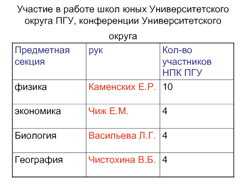 Слайд 11Участие в работе школ юных Университетского округа ПГУ, конференции Университетского округа