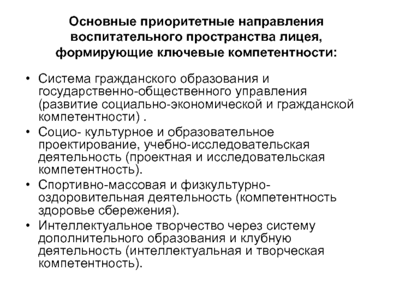 Слайд 4Основные приоритетные направления воспитательного пространства лицея, формирующие ключевые компетентности: