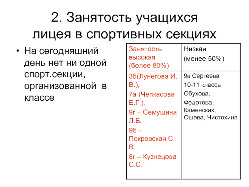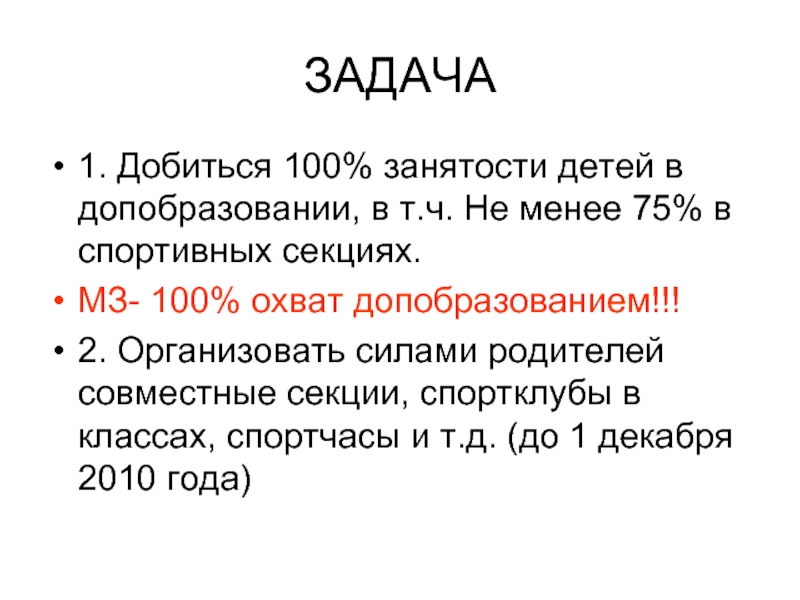 Добиться 100% занятости детей в допобразовании, в т.ч. Не менее 75% в спортивных секциях. Организовать силами родителей совместные секции, спортклубы в классах, спортчасы и т.д. (до 1 декабря 2010 года)