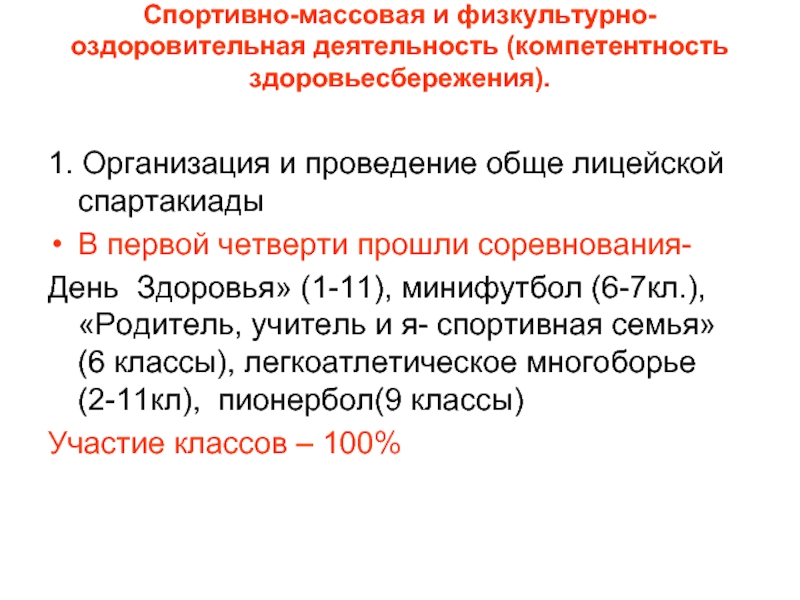 Слайд 14Спортивно-массовая и физкультурно-оздоровительная деятельность (компетентность здоровьесбережения).