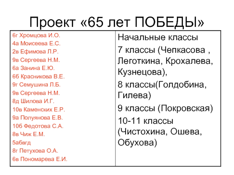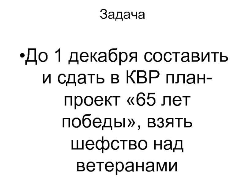 До 1 декабря составить и сдать в КВР план- проект «65 лет победы», взять шефство над ветеранами