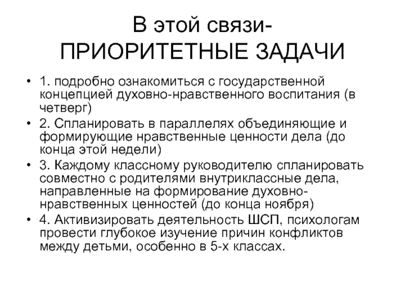 3. Каждому классному руководителю спланировать совместно с родителями внутриклассные дела, направленные на формирование духовно-нравственных ценностей (до конца ноября)