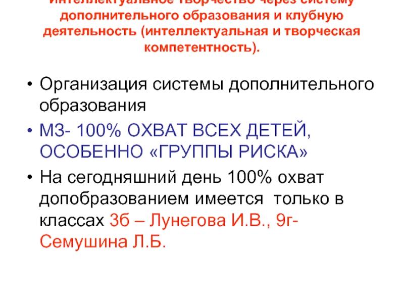 На сегодняшний день 100% охват допобразованием имеется только в классах 3б – Лунегова И.В., 9г- Семушина Л.Б.