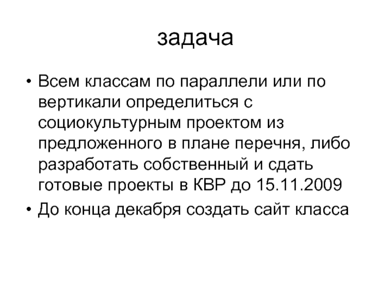 Всем классам по параллели или по вертикали определиться с социокультурным проектом из предложенного в плане перечня, либо разработать собственный и сдать готовые проекты в КВр до 15.11.2009. Создать сайт класса