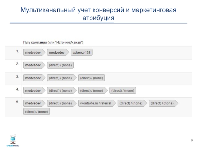 Слайд 9Мультиканальный учет конверсий и маркетинговая атрибуция