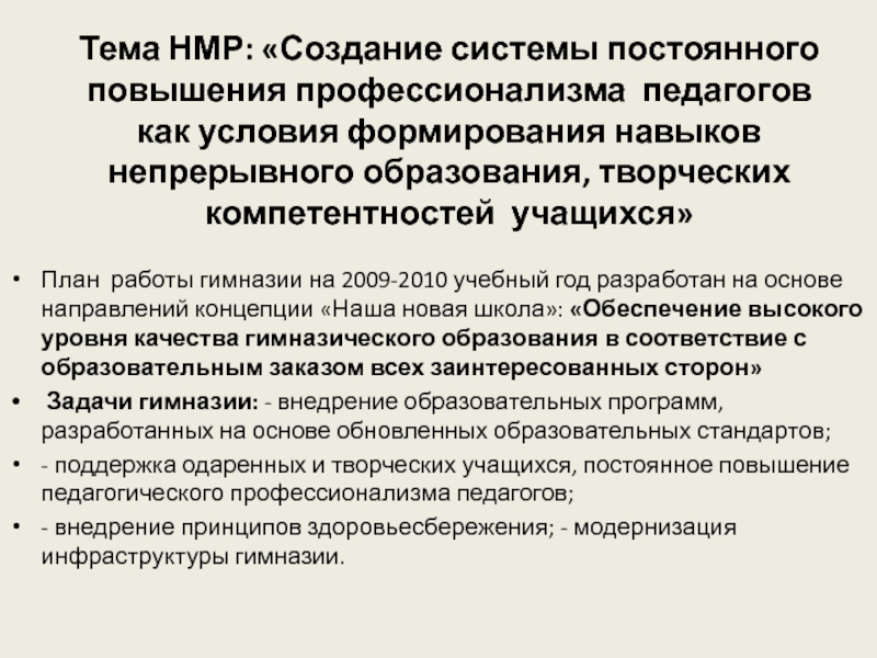 План работы гимназии на 2009-2010 учебный год разработан на основе направлений концепции «Наша новая школа»: «Обеспечение высокого уровня качества гимназического образования в соответствие с образовательным заказом всех заинтересованных сторон»