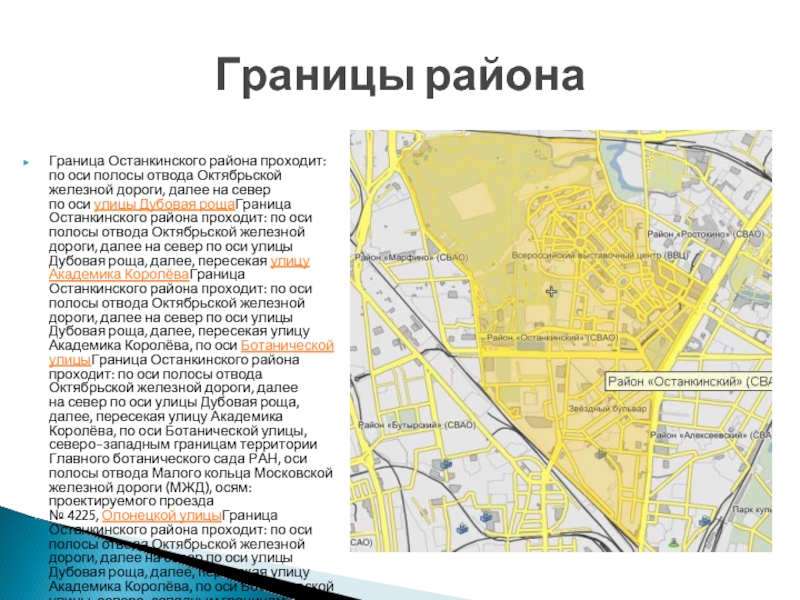 на север по оси улицы Дубовая рощаГраница Останкинского района проходит: по оси полосы отвода Октябрьской железной дороги, далее на север по оси улицы Дубовая роща, далее, пересекая улицу Академика КоролёваГраница Останкинского района проходит: по оси полосы отвода Октябрьской железной дороги, далее на север по оси улицы Дубовая роща, далее, пересекая улицу Академика Королёва, по оси Ботанической улицыГраница Останкинского района проходит: по оси полосы отвода Октябрьской железной дороги, далее на север по оси улицы Дубовая роща, далее, пересекая улицу Академика Королёва, по оси Ботанической улицы, северо-западным границам территории Главного ботанического сада РАН, оси полосы отвода Малого кольца Московской железной дороги (МЖД), осям: проектируемого проезда № 4225, Олонецкой улицыГраница Останкинского района проходит: по оси полосы отвода Октябрьской железной дороги, далее на север по оси улицы Дубовая роща, далее, пересекая улицу Академика Королёва, по оси Ботанической улицы, северо-западным границам территории Главного ботанического сада РАН, оси полосы отвода Малого кольца Московской железной дороги (МЖД), осям: проектируемого проезда № 4225, Олонецкой улицы, улицы ДекабристовГраница Останкинского района проходит: по оси полосы отвода Октябрьской железной дороги, далее на север по оси улицы Дубовая роща, далее, пересекая улицу Академика Королёва, по оси Ботанической улицы, северо-западным границам территории Главного ботанического сада РАН, оси полосы отвода Малого кольца Московской железной дороги (МЖД), осям: проектируемого проезда № 4225, Олонецкой улицы, улицы Декабристов,Сельскохозяйственной улицыГраница Останкинского района проходит: по оси полосы отвода Октябрьской железной дороги, далее на север по оси улицы Дубовая роща, далее, пересекая улицу Академика Королёва, по оси Ботанической улицы, северо-западным границам территории Главного ботанического сада РАН, оси полосы отвода Малого кольца Московской железной дороги (МЖД), осям: проектируемого проезда № 4225, Олонецкой улицы, улицы Декабристов,Сельскохозяйственной улицы, оси Малого кольца МЖД, осям: улицы Вильгельма ПикаГраница Останкинского района проходит: по оси полосы отвода Октябрьской железной дороги, далее на север по оси улицы Дубовая роща, далее, пересекая улицу Академика Королёва, по оси Ботанической улицы, северо-западным границам территории Главного ботанического сада РАН, оси полосы отвода Малого кольца Московской железной дороги (МЖД), осям: проектируемого проезда № 4225, Олонецкой улицы, улицы Декабристов,Сельскохозяйственной улицы, оси Малого кольца МЖД, осям: улицы Вильгельма Пика, Сельскохозяйственной улицыГраница Останкинского района проходит: по оси полосы отвода Октябрьской железной дороги, далее на север по оси улицы Дубовая роща, далее, пересекая улицу Академика Королёва, по оси Ботанической улицы, северо-западным границам территории Главного ботанического сада РАН, оси полосы отвода Малого кольца Московской железной дороги (МЖД), осям: проектируемого проезда № 4225, Олонецкой улицы, улицы Декабристов,Сельскохозяйственной улицы, оси Малого кольца МЖД, осям: улицы Вильгельма Пика, Сельскохозяйственной улицы, восточной границе территории Всероссийского выставочного центра (ВВЦ), осям: улицы Сергея ЭйзенштейнаГраница Останкинско