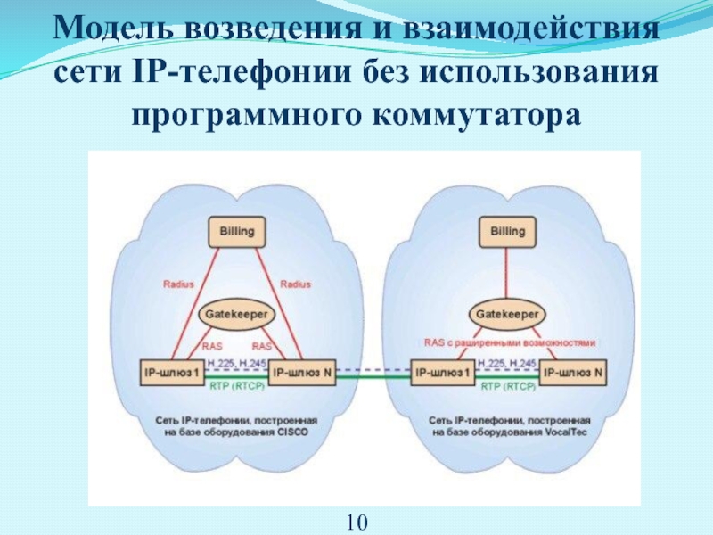 Слайд 10Модель возведения и взаимодействия сети IP-телефонии без использования программного коммутатора