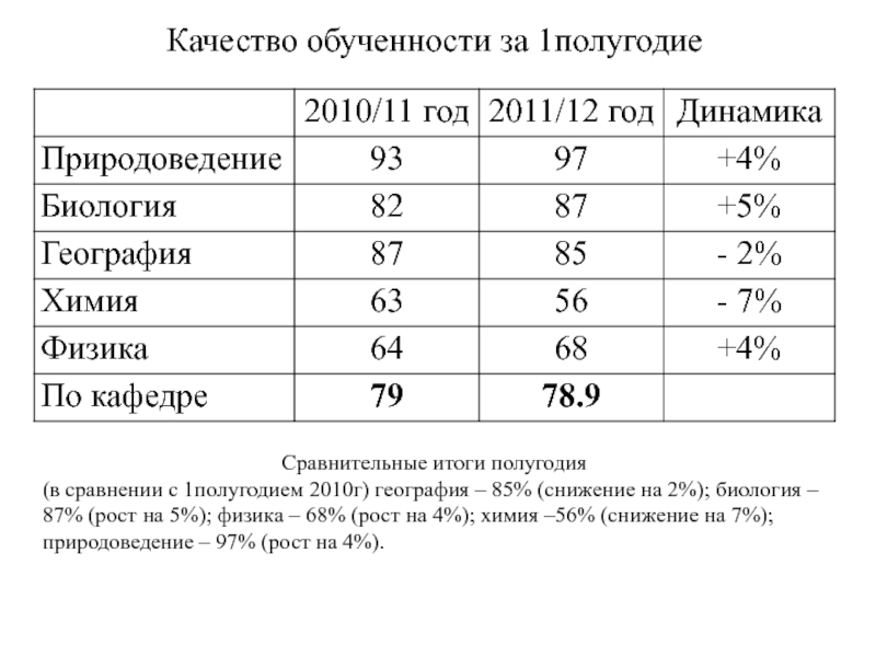 – 85% (снижение на 2%); биология – 87% (рост на 5%); физика – 68% (рост на 4%); химия –56% (снижение на 7%); природоведение – 97% (рост на 4%).