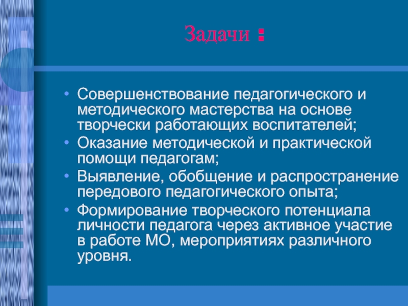 Совершенствование педагогического и методического мастерства на основе творчески работающих воспитателей;