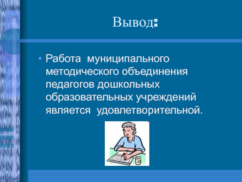 Работа муниципального методического объединения педагогов дошкольных образовательных учреждений является удовлетворительной.