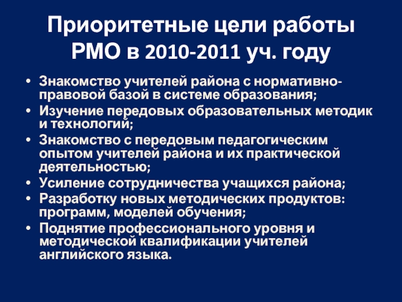 Слайд 3Приоритетные цели работы РМО в 2010-2011 уч. году