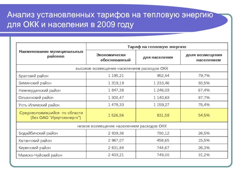 Слайд 4Анализ установленных тарифов на тепловую энергию для ОКК и населения в