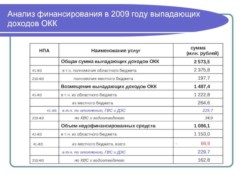 Слайд 2Анализ финансирования в 2009 году выпадающих доходов ОКК