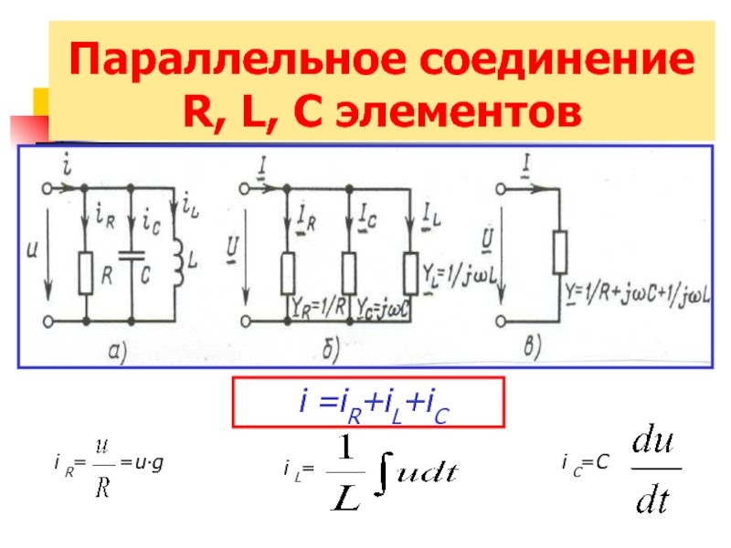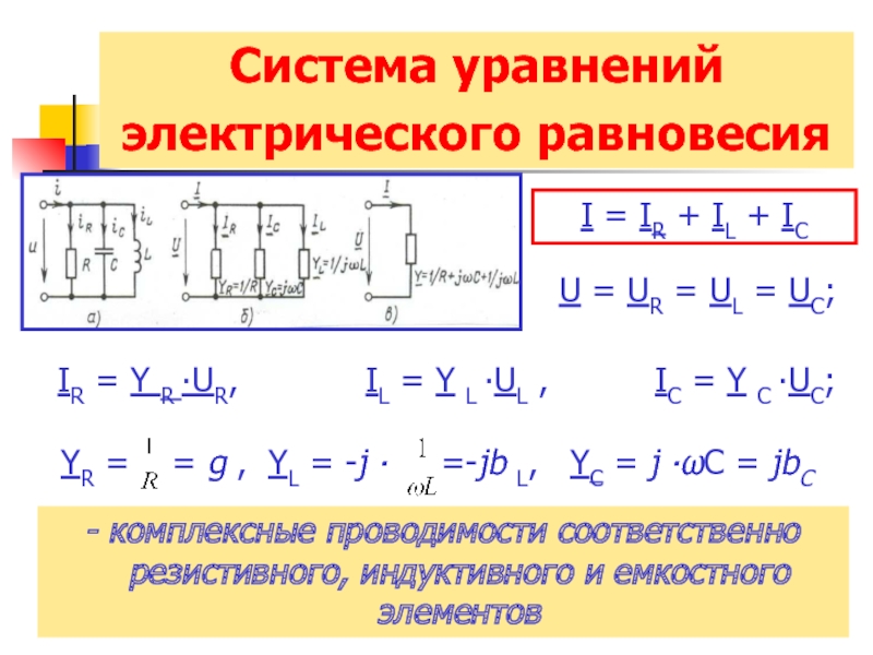 - комплексные проводимости соответственно резистивного, индуктивного и емкостного элементов