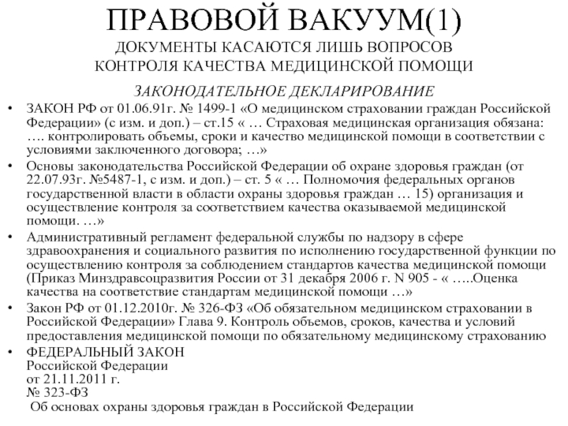 Основы законодательства Российской Федерации об охране здоровья граждан (от 22.07.93г. №5487-1, с изм. и доп.) – ст. 5 « … Полномочия федеральных органов государственной власти в области охраны здоровья граждан … 15) организация и осуществление контроля за соответствием качества оказываемой медицинской помощи. …»