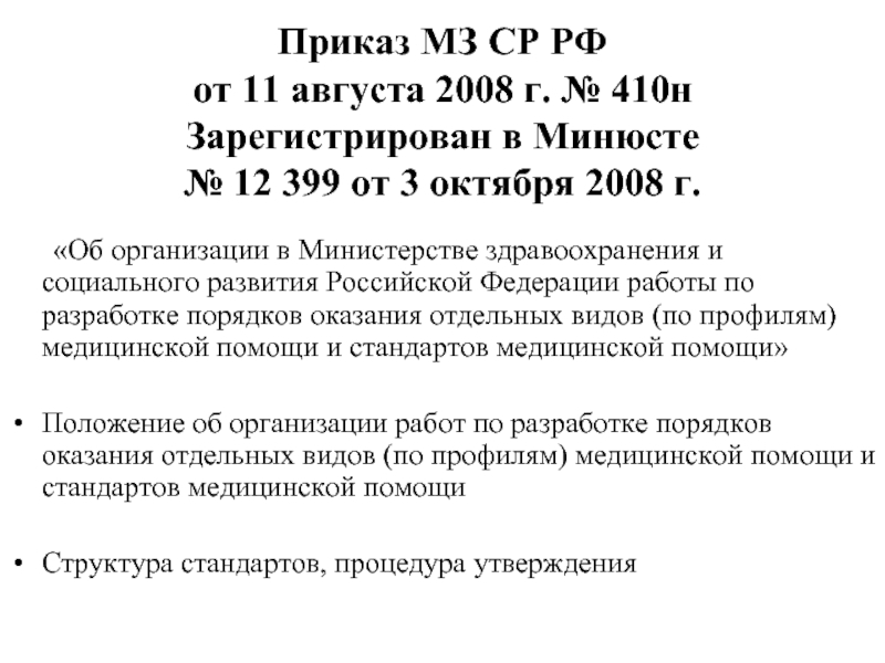 «Об организации в Министерстве здравоохранения и социального развития Российской Федерации работы по разработке порядков оказания отдельных видов (по профилям) медицинской помощи и стандартов медицинской помощи»