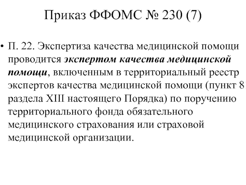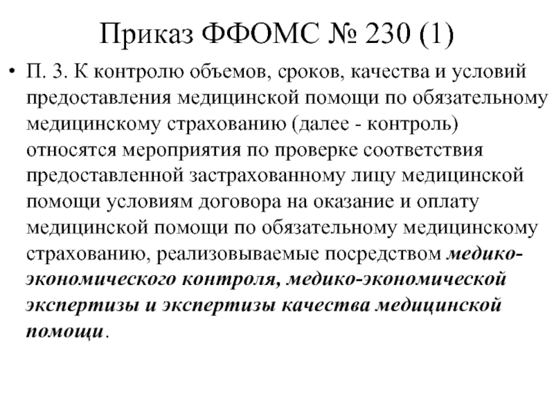 Приказ ФФОМС от 01.12.2010 № 230 «Об утверждении Порядка организации и проведения контроля объемов, сроков, качества и условий предоставления медицинской помощи по обязательному медицинскому страхованию»