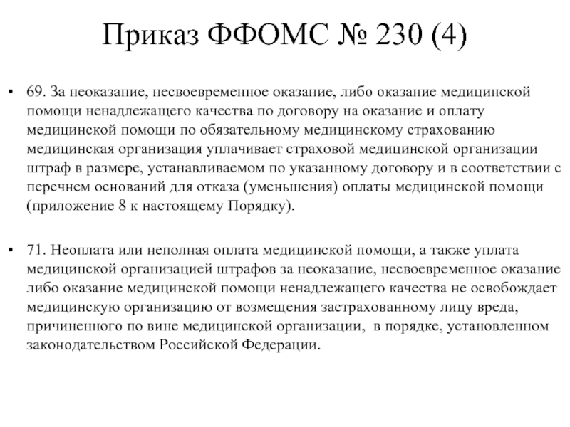 71. Неоплата или неполная оплата медицинской помощи, а также уплата медицинской организацией штрафов за неоказание, несвоевременное оказание либо оказание медицинской помощи ненадлежащего качества не освобождает медицинскую организацию от возмещения застрахованному лицу вреда, причиненного по вине медицинской организации, в порядке, установленном законодательством Российской Федерации.